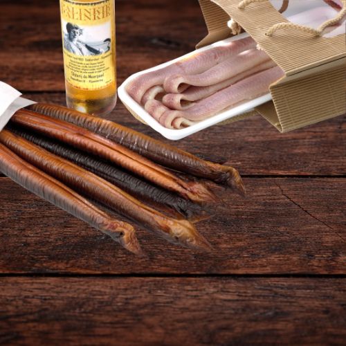Een luxe geschenkpakket met diverse vis delicatessen. Dit pakket bevat 500 gram gerookte paling, 100 gram palingfilet en een fles palinglikeur 32% vol.